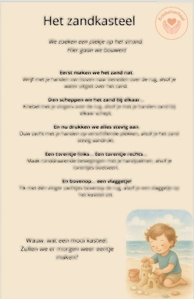 Elk verhaal neemt je mee in een herkenbaar moment — van een zandkasteel bouwen tot een ijsje kopen of zwemmen met vissen — terwijl bij elke zin een zachte aanraking hoort. Zo ontstaat er spelenderwijs een rustmoment vol verbinding, verbeelding en lijfelijke aandacht.